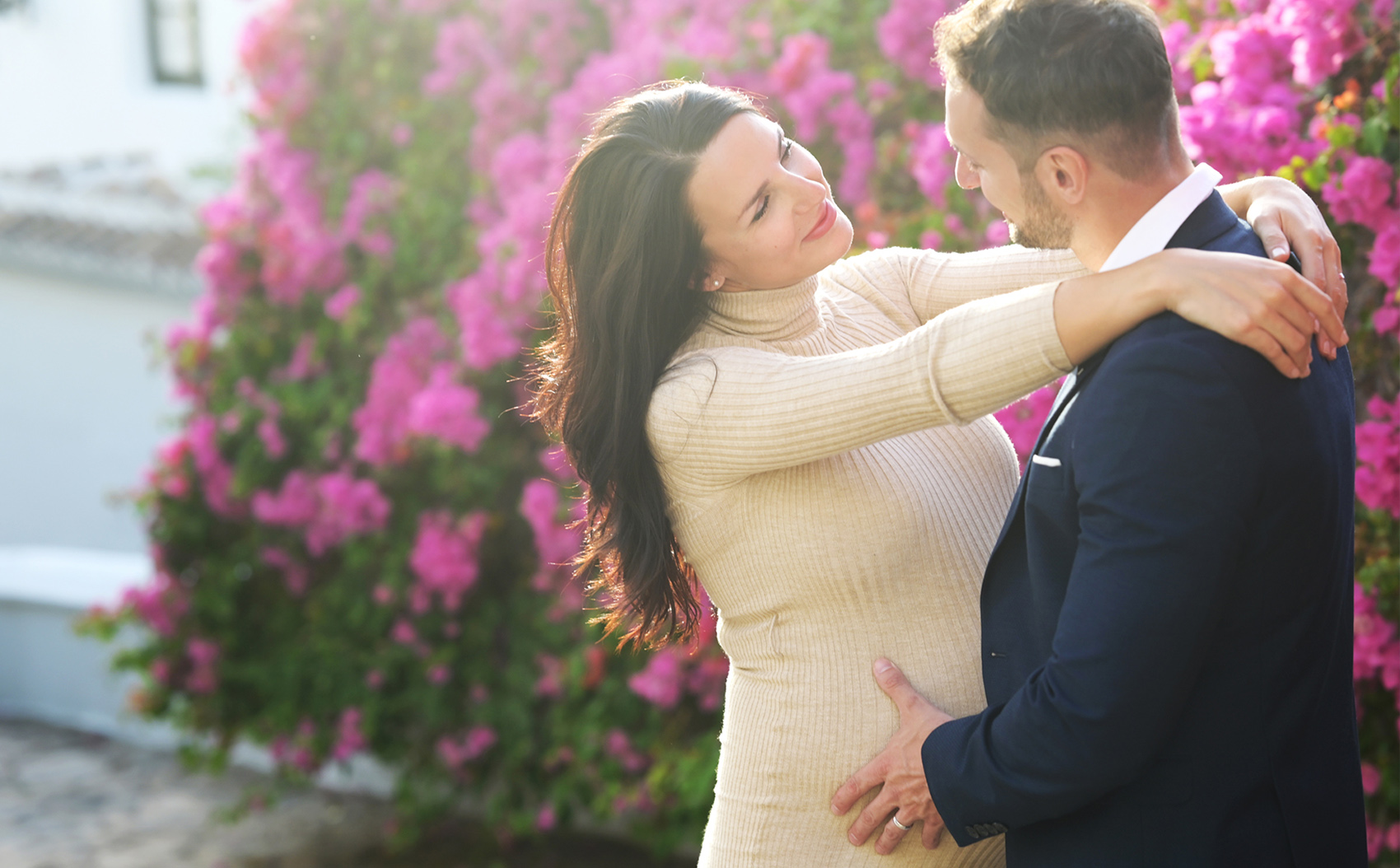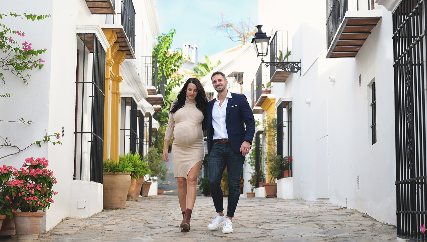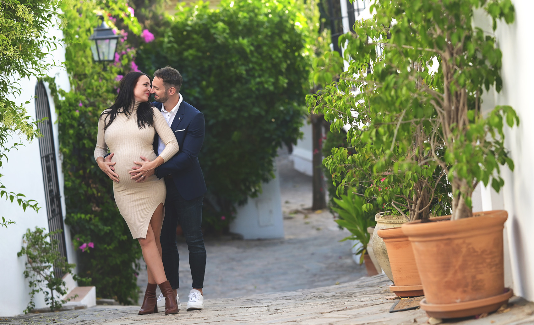 Para las sesiones de embarazada tenemos muchas ubicaciones y en función de la pareja cualquiera es buena, desde su propia casa si es espaciosa y luminosa, nuestro estudio fotográfico, con las puesta de sol en playa, jardines o incluso un campo salvaje es un lugar ideal para una sesión de embarazada, pero en esta ocasión tuvimos la suerte de encontrar un lugar perfecto para la sesión, una pequeña urbanización entre Estepona y Marbella con calles empedradas, paredes blancas, llenas de macetas, luz, color y vida que nos ofrece un escenario idílico para un reportaje de embarazada.